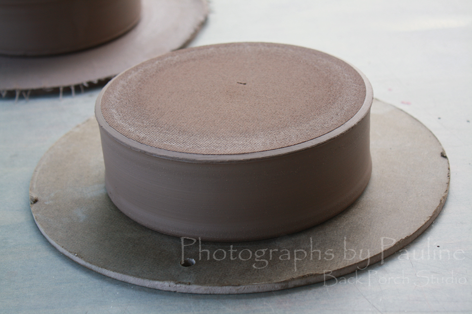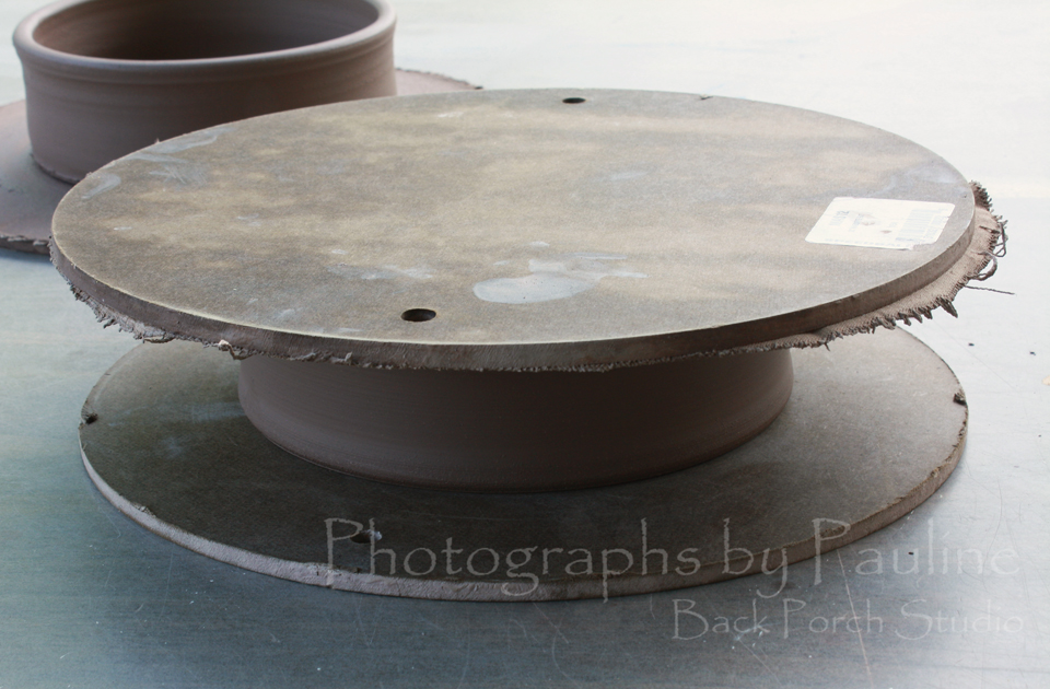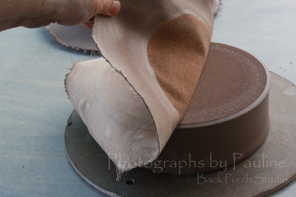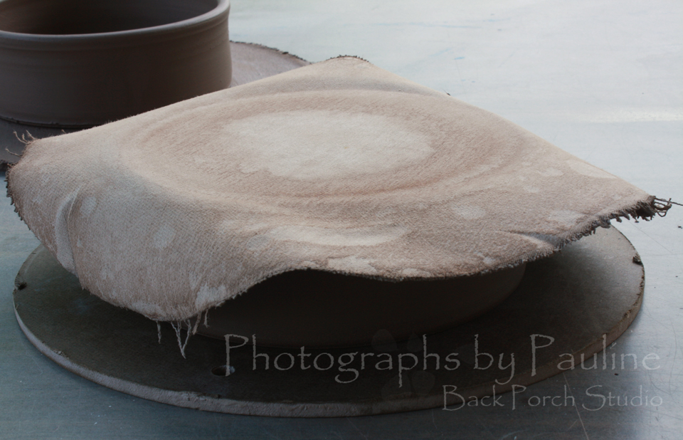 I had some extra time over the winter to research alternative ways of taking large pots off of the bat.  I came across a discussion thread on potters.org: “How to get it off the bat?” . In short, the brilliant solution was to use a piece of canvas or heavy denim on the bat.  Throw the pot on top of the canvas then . . .