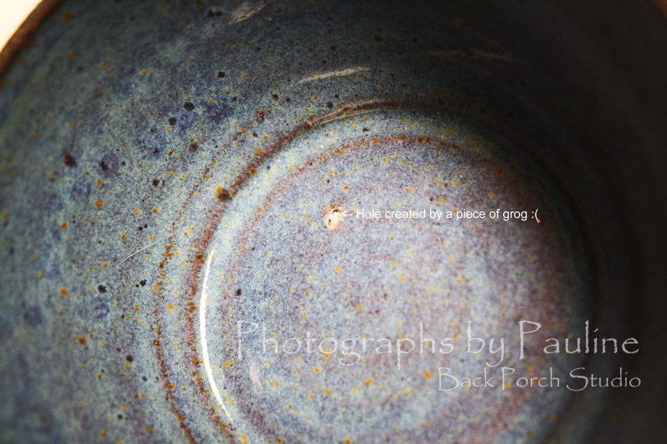 In this case, a rather large piece of grog made a hole in a small bowl. I didn’t feel comfortable selling this piece due to the grog hole but it is such a cute little piece and I couldn’t just throw it away . . .