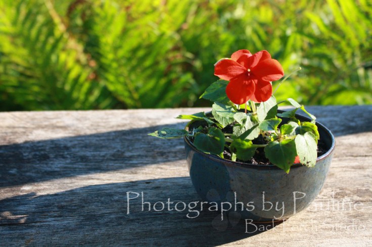 So, I planted a cheery little volunteer impatiens flower in the sweet little bowl. I love it as it sits on my table in my back porch studio. 🙂