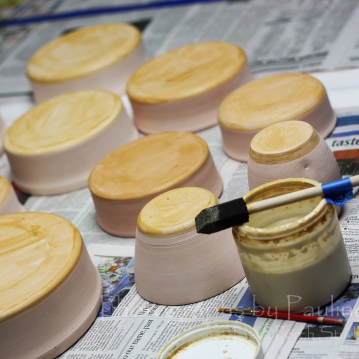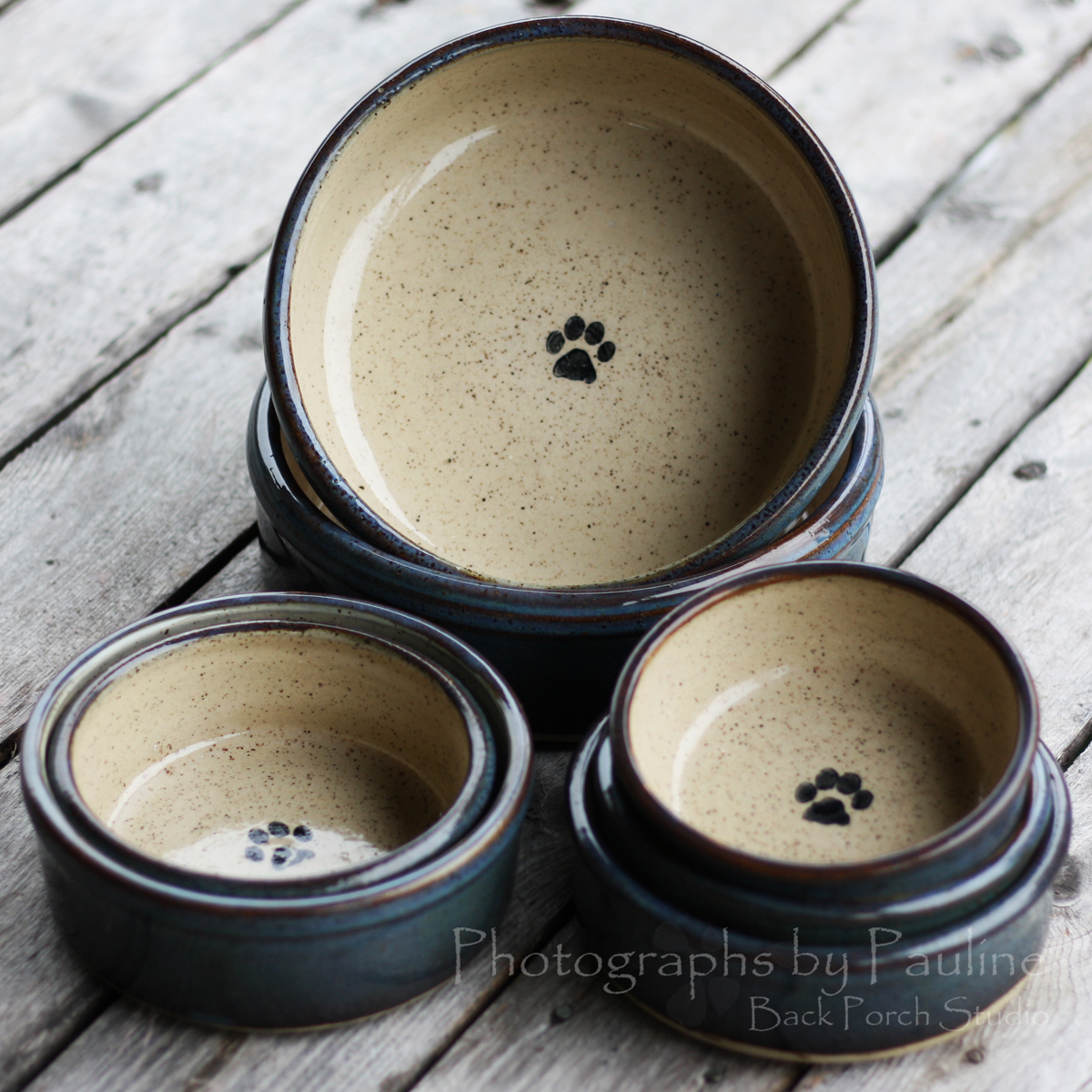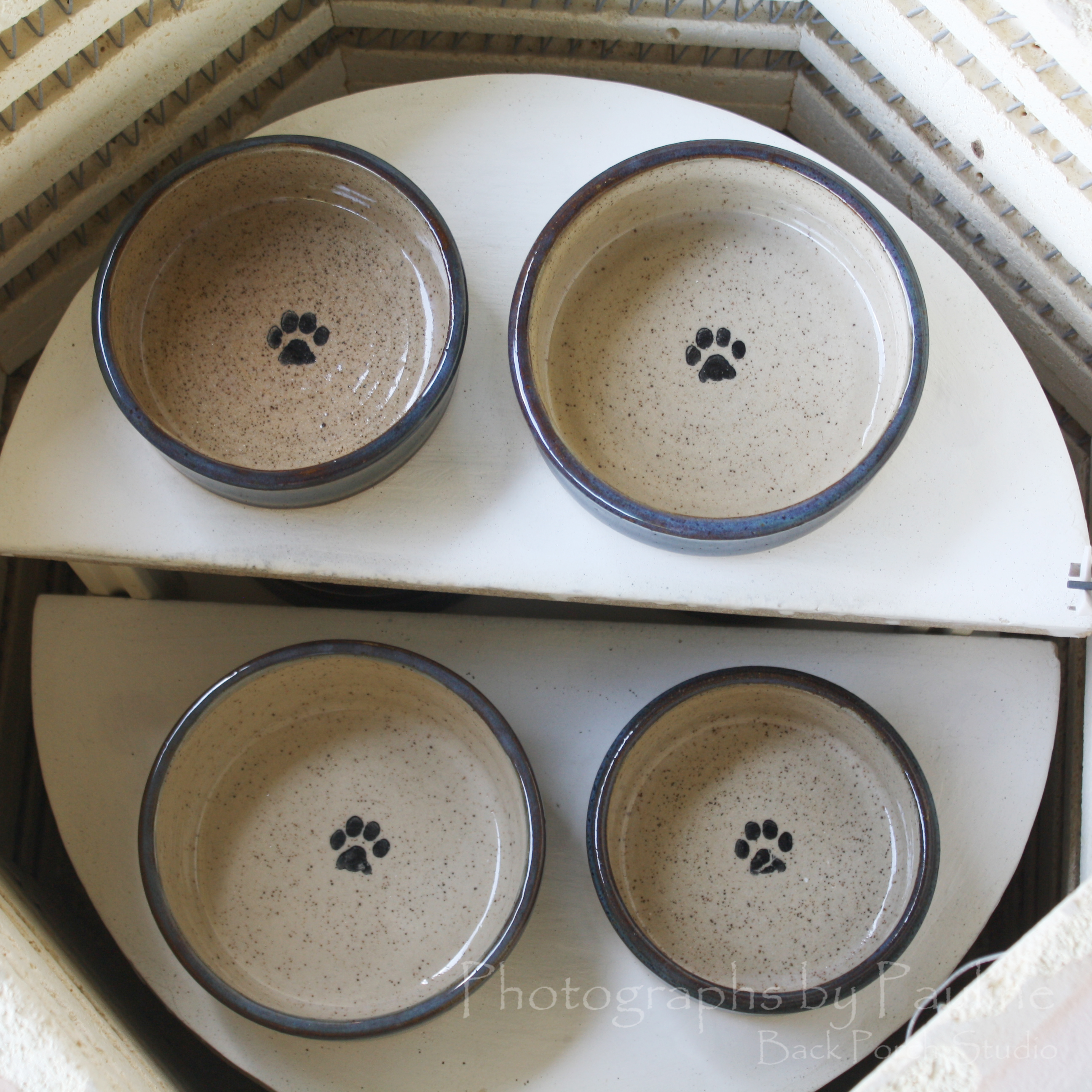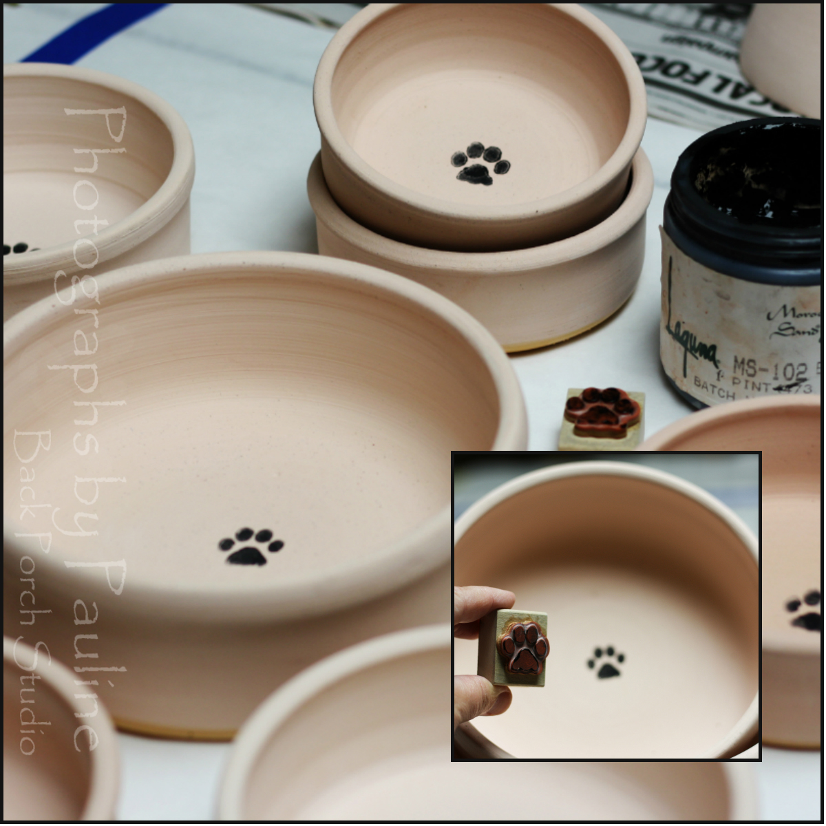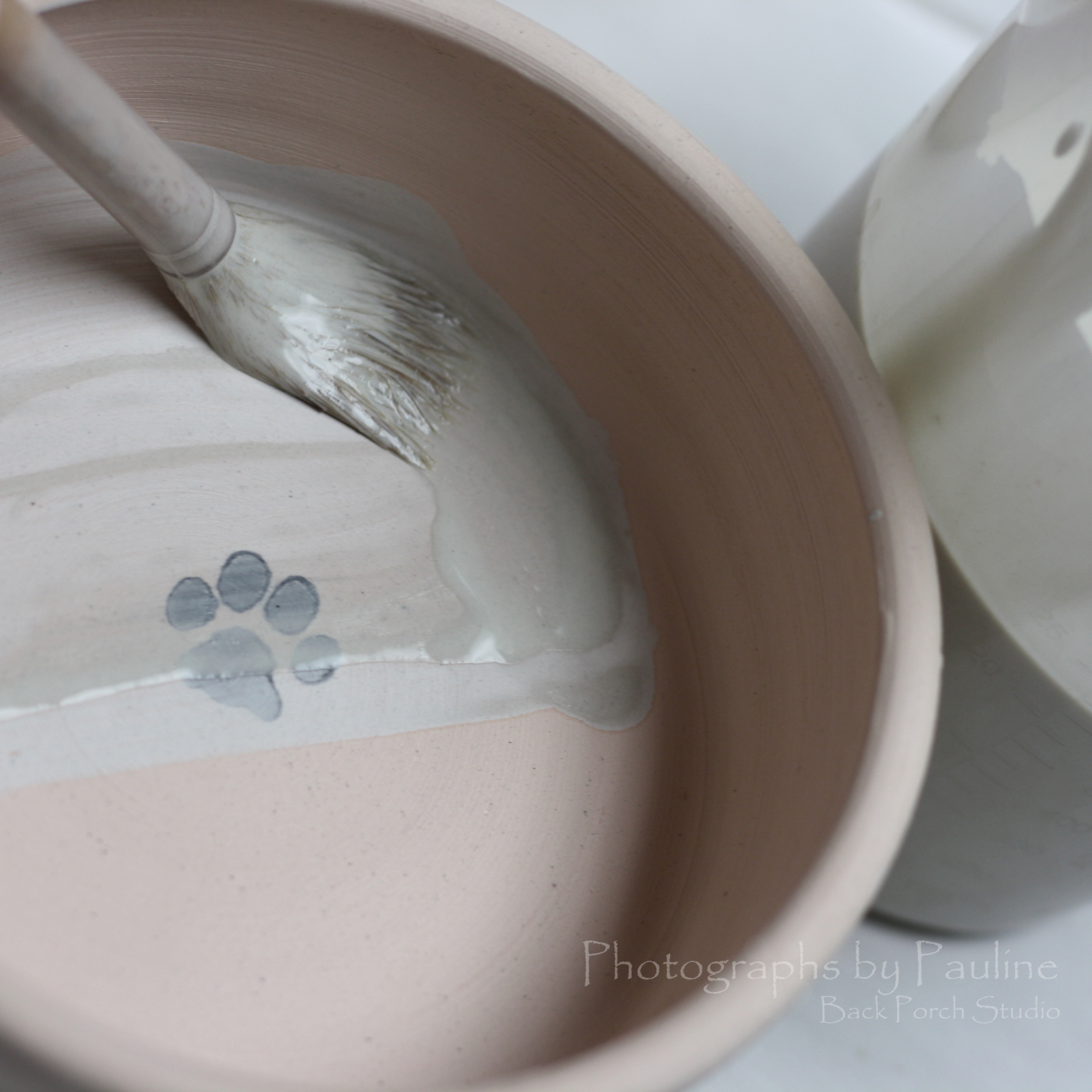 First, I wax my bottoms. The wax prevents the glazes from adhering to the bottom of the pot and prevents glazes from sticking the kiln shelf potentially ruining the piece of pottery and making a big mess to clean up on the kiln shelf.I hand stamp a paw print inside each of my pet dishes with an ebony wash.