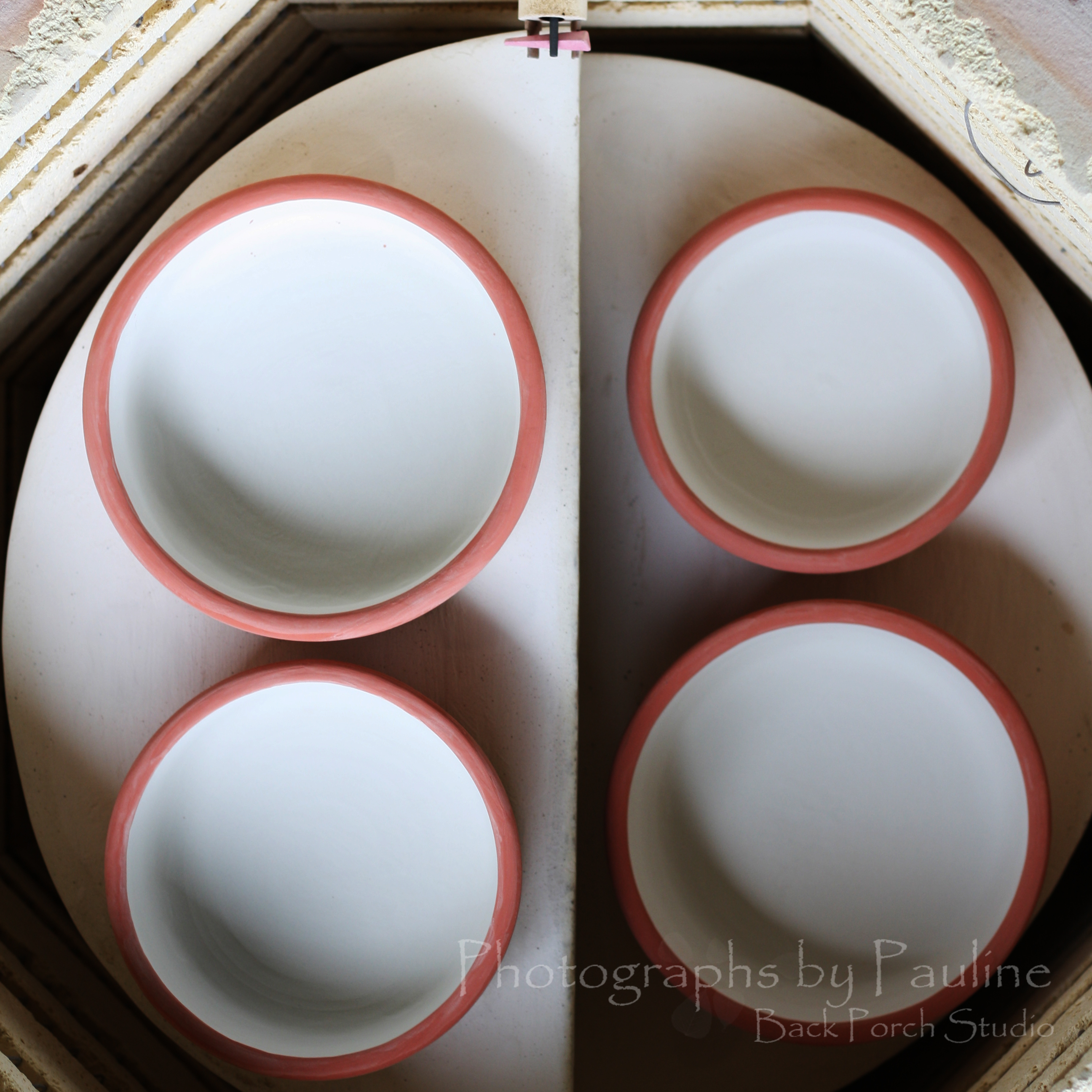 Blue and cream pet dishes glazed (blue on the outside, clear on the inside) and ready to be fired in the electric kiln.