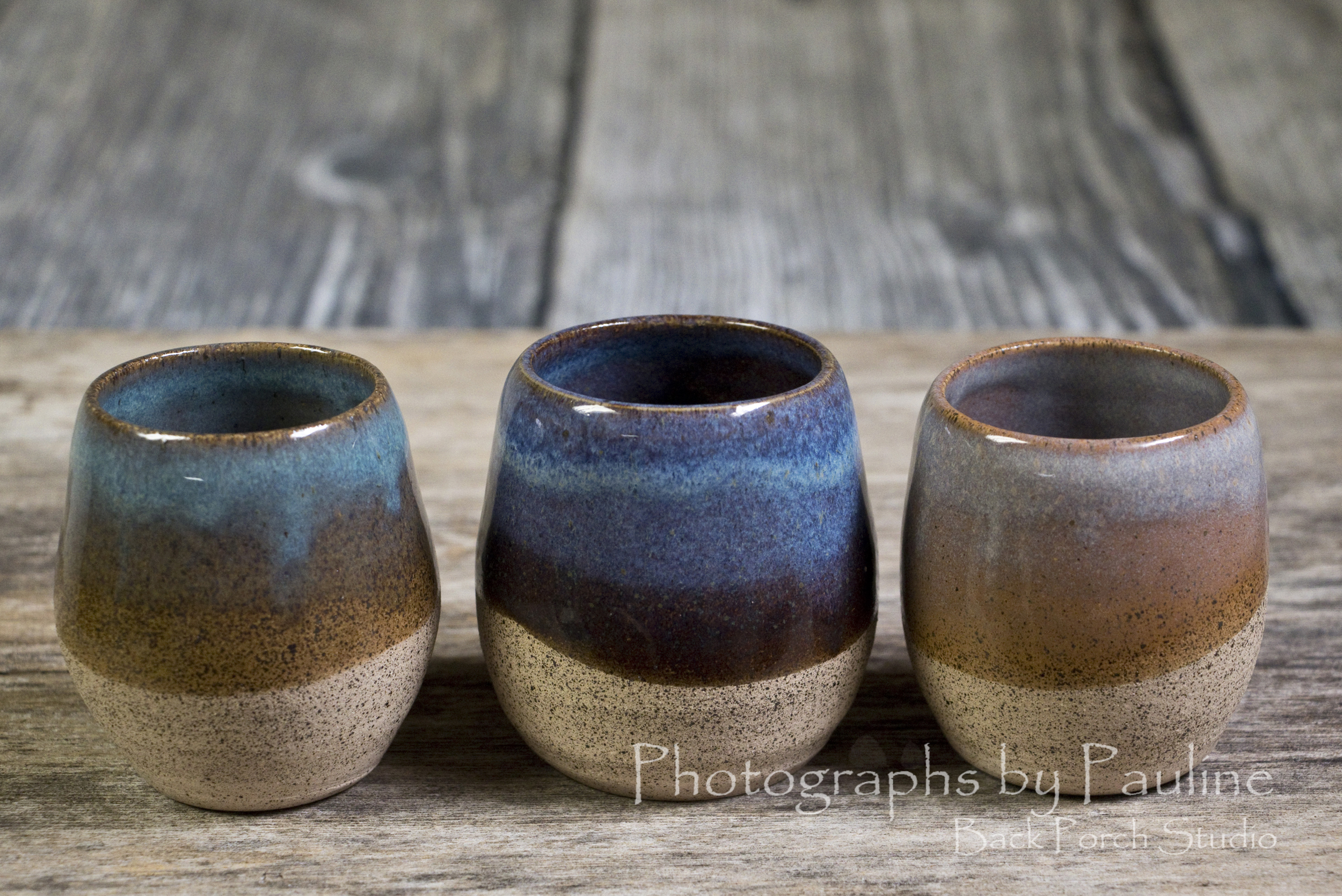 New clay! Left: Turquoise on new clay. Middle: Rutile Blue on new clay. Right: New glaze, sepia, on new clay