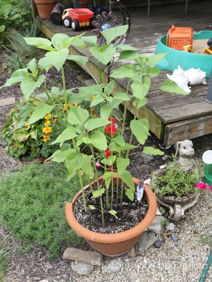 I planted my 3rd round of sunflowers in a flower pot next to my back porch.