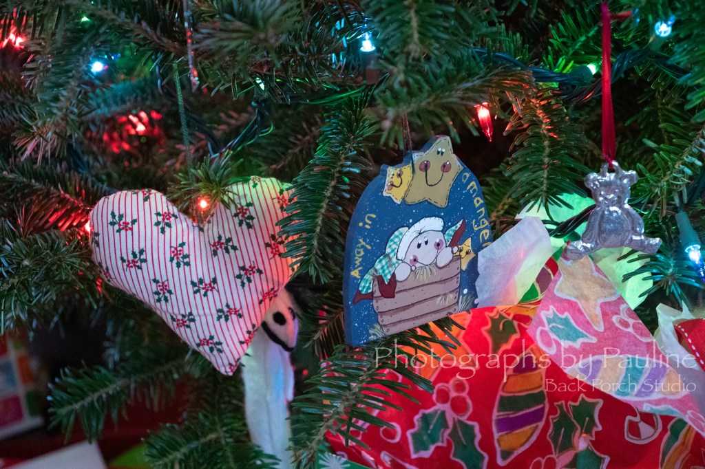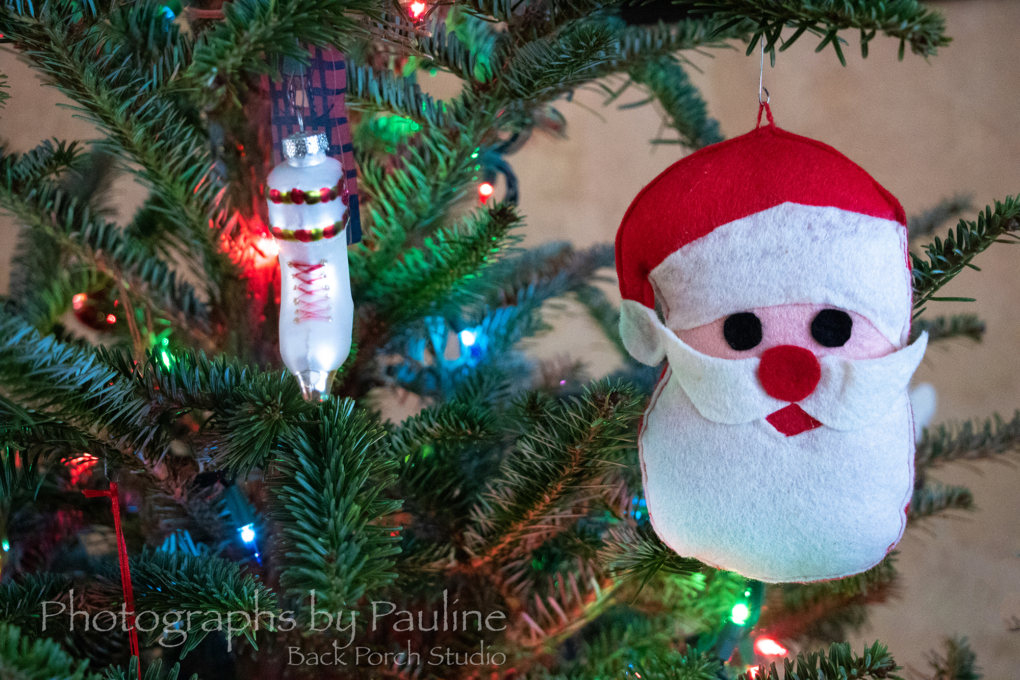 Handmade hearts made by my mother-in-law. Ball ornament to the left given to us by our grandson. Sparkly prancing reindeer, a new addition this year because . . . 2020 and glitter!Mostly handmade decorations: Tall angel with gold star in background made by my mother-in-law, Nativity made by mother-in-law, White ceramic Christmas tree – my 1st attempt to make a ceramic tree. The faceless angel, Joy is her name, was my Mom’s.Santa made by my Great Aunt. Ice Skate ornament given to us from my Mom.Away in a Manger…hand painted by my mother-in-law Thanks to our grandson’s suggestion this year, we added M & M cookies to our Holiday baking! YUM!