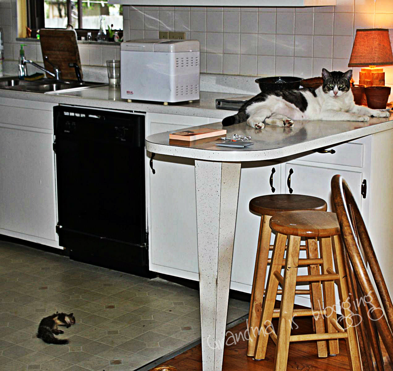 He promptly plopped the unmoving squirrel onto the kitchen floor and jumped up on to the kitchen counter his throne.