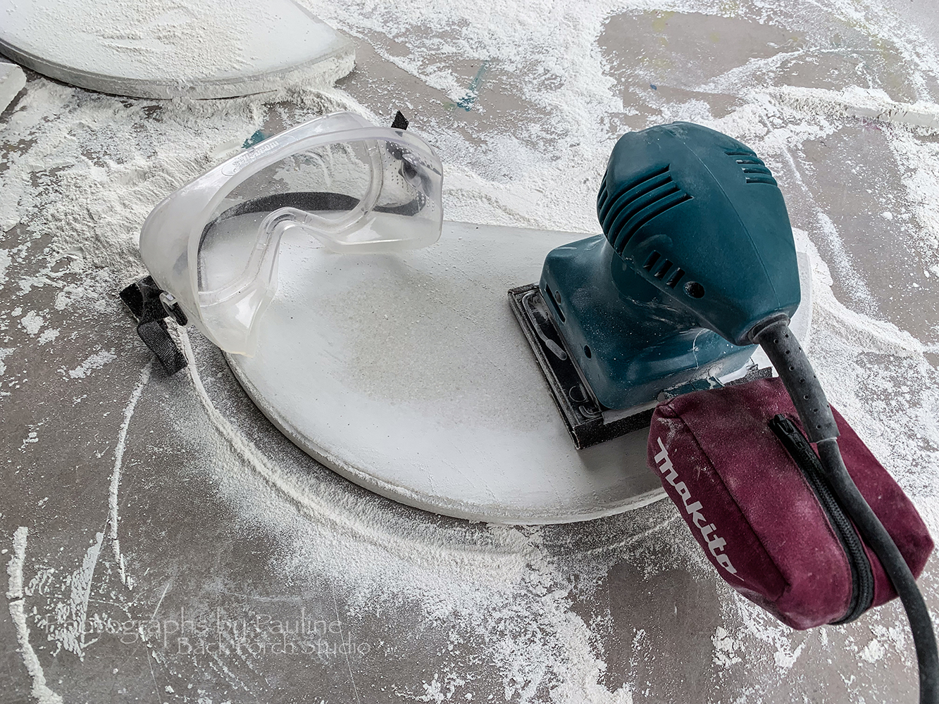 And over time, repeated applications of kiln wash can make for uneven firing surface. Layers of kiln wash also crack, chip and flake off over time which can potentially ruin glazed pottery pieces. When the kiln shelf surface become flakey and uneven it is time to sand off the layers of kiln wash which is what I did this past week.