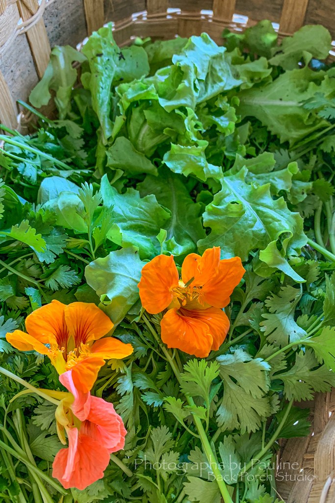 My first harvest from our garden: cilantro, nasturtiums (first year growing them) and volunteer lettuce!