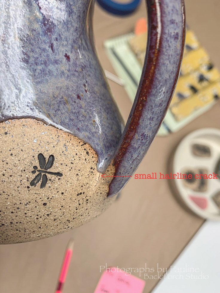 Unforeseen challenges such as this hairline crack is the frustrating nature of pottery rendering this particular dragonfly mug irregular and not appropriate to sell due to safety concerns. Hairline cracks have a tendency to crack further under extreme temperature changes in microwaves and dishwashers.