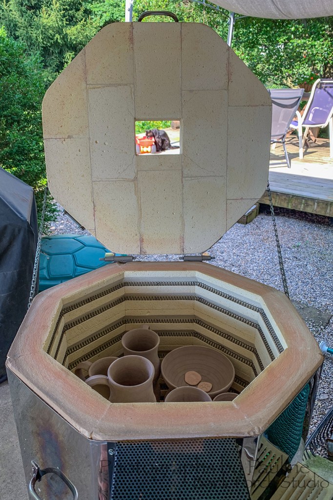 After all the water vapor and gases have burned off, I place the kiln hole cover on top of the hole allowing the heat to work on the clay and glazes.