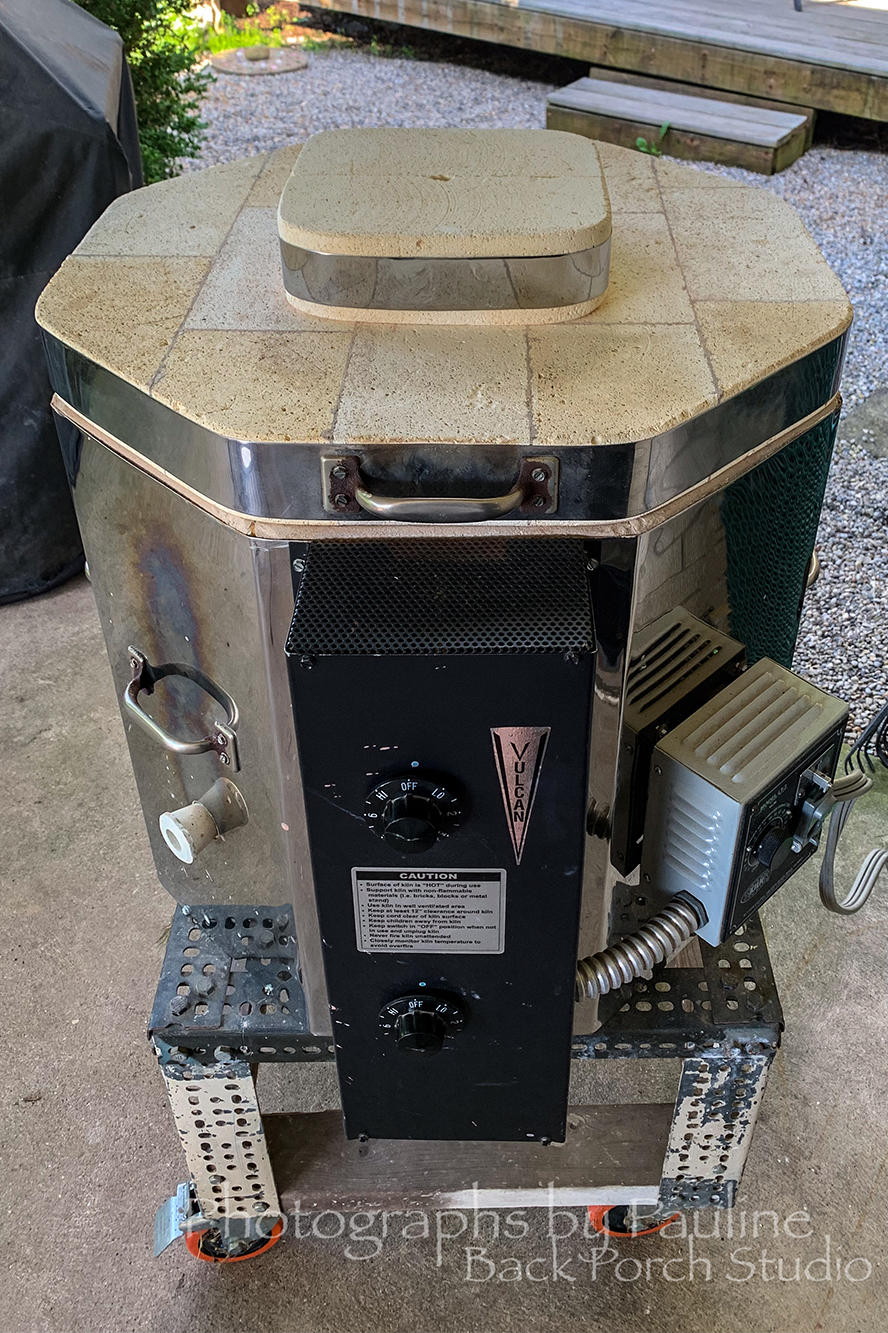 My electric kiln, however, is fairly primitive. I do not have a downdraft exhaust system because I fire outside on my back porch when the weather is sunny and dry! Water vapor, gases and fumes freely escape through the hole in the lid.